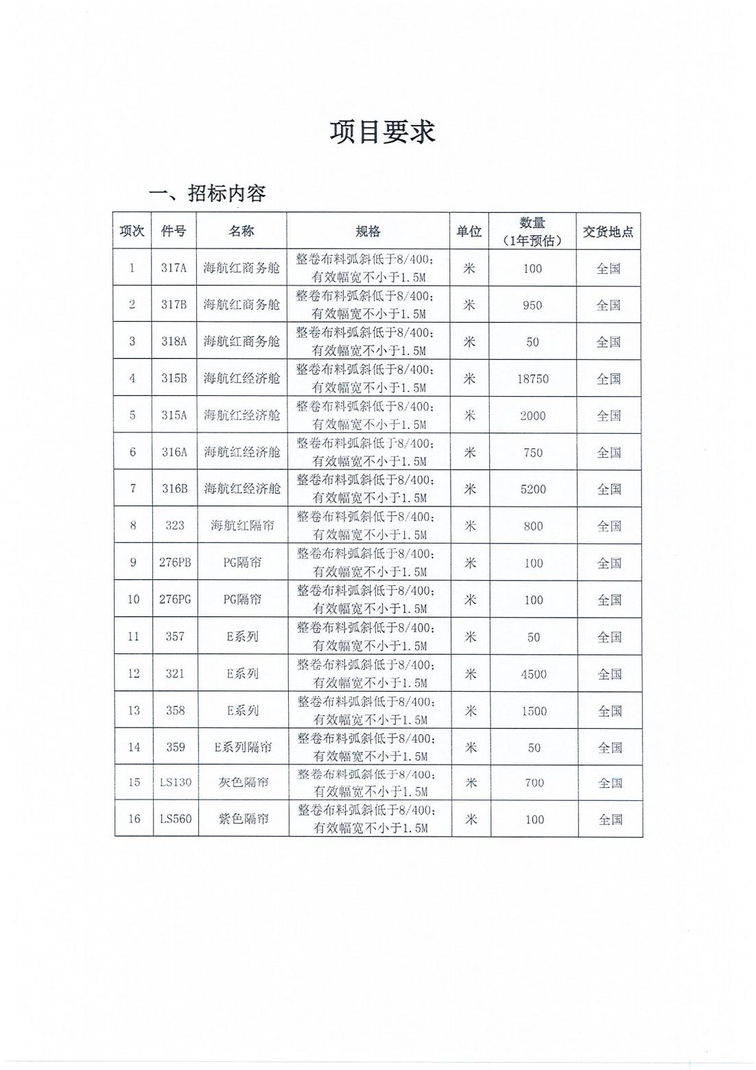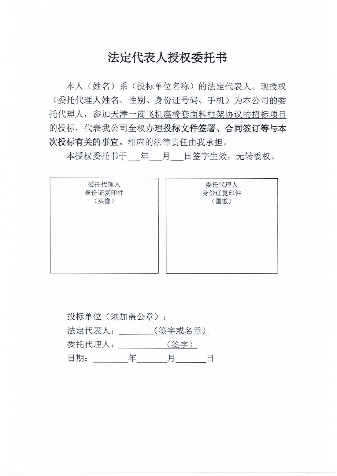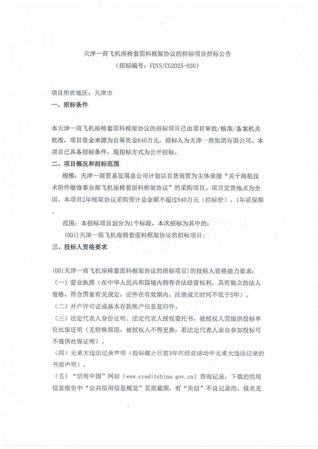 天津一商飞机座椅套面料框架协议的招标项目招标公告