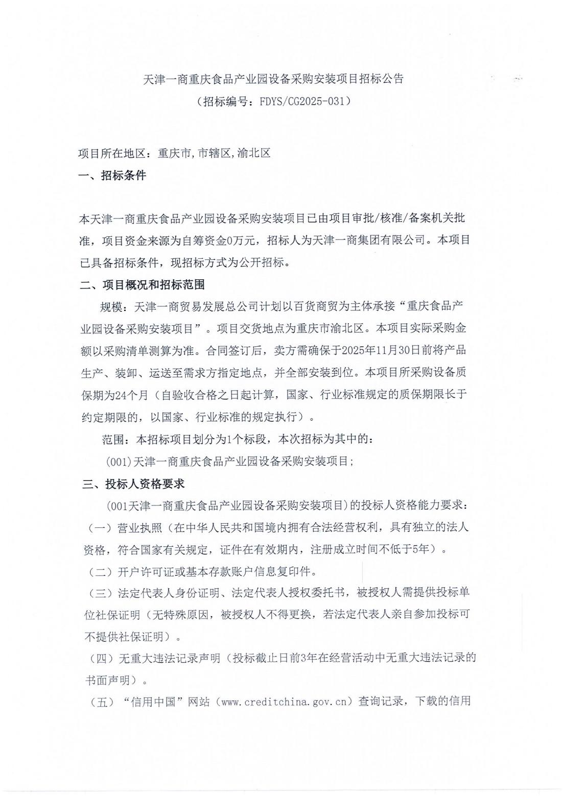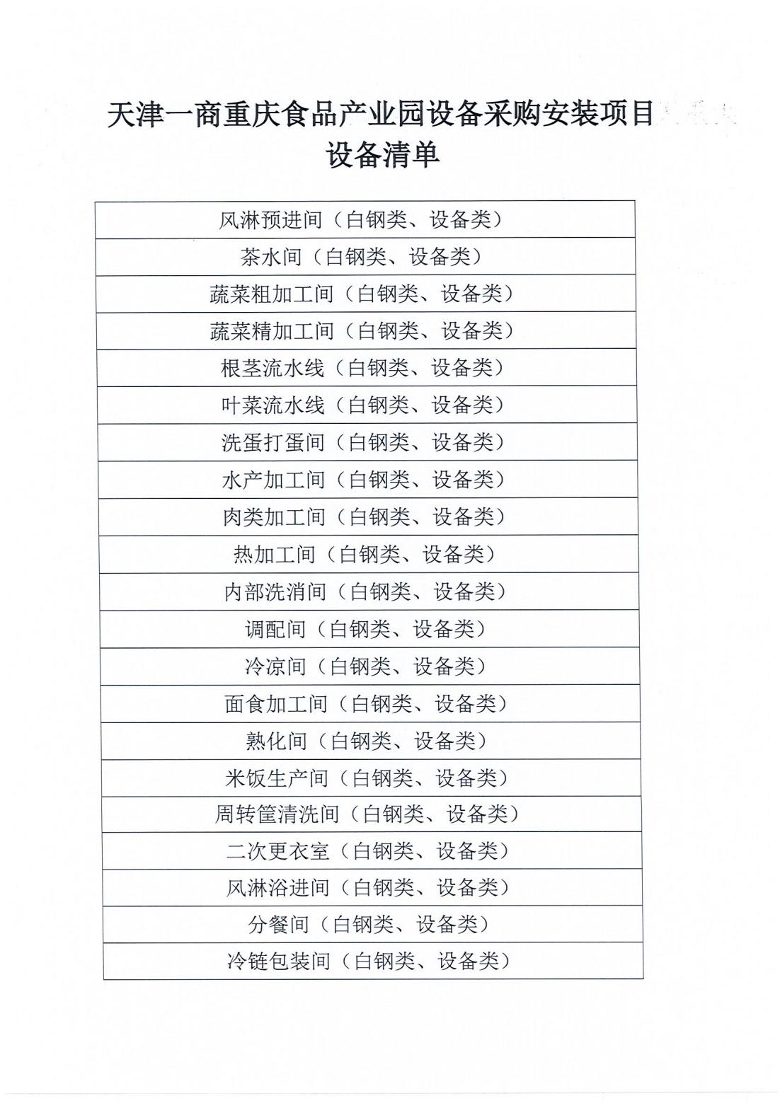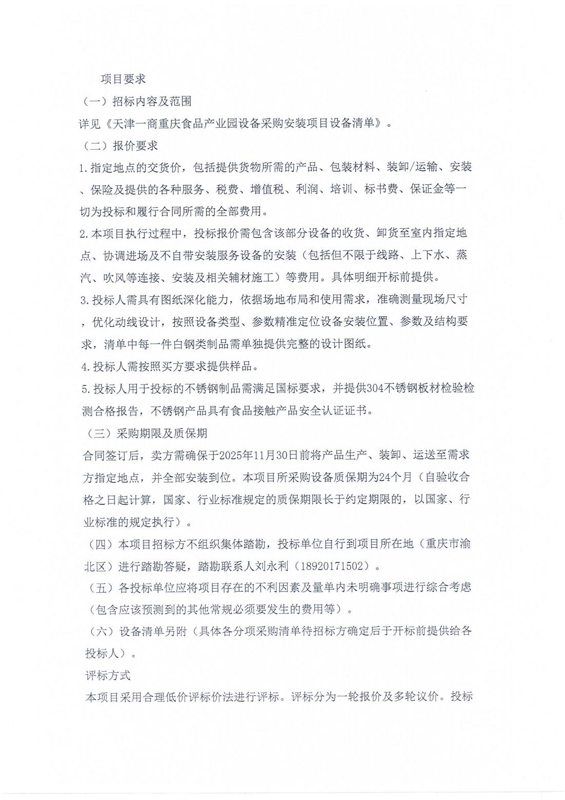 天津一商重庆食品产业园设备采购安装项目招标公告