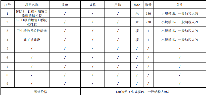 (一)项目名称:关于资产运营总公司海津大厦3,11层内窗防水项目。