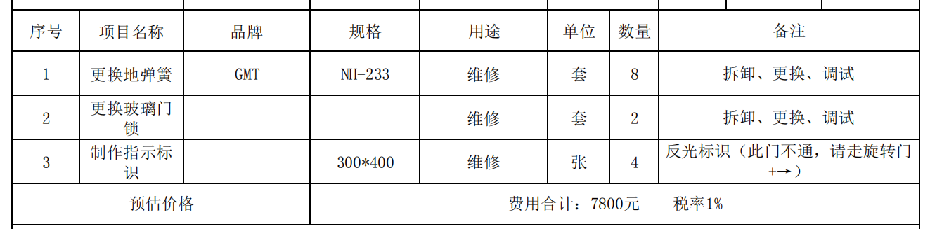 (一)项目名称:关于友谊新都百货三号门更换地弹簧、一层大堂玻璃门更换锁具维修项目。