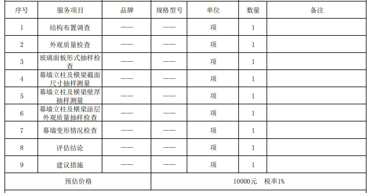 (一)项目名称:关于友谊新都百货玻璃幕墙检测鉴定项目。
