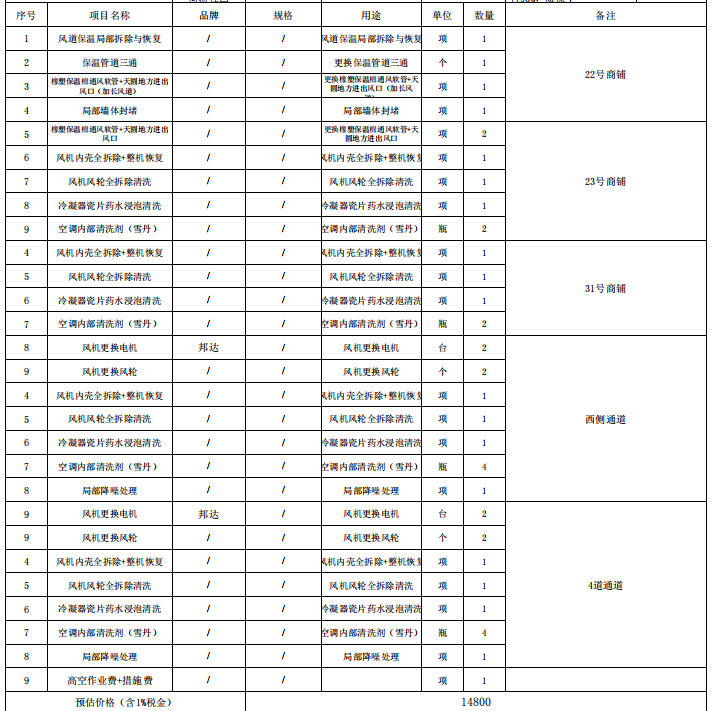 (一)项目名称:关于资产运营总公司南开茶城22号23号31号西侧通道四道风机盘管维修项目。