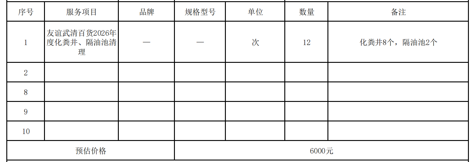 (一)项目名称:关于友谊武清百货2026年度化粪井、隔油池清理项目。