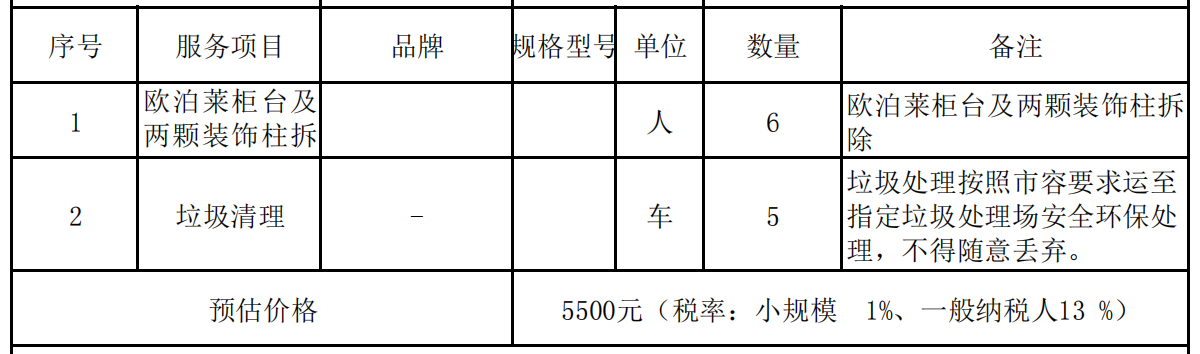 (一)项目名称:关于友谊大港百货拆除百货商场欧泊莱柜台及装饰柱拆除项目。