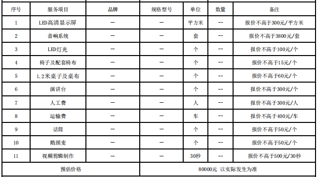 1.包括但不限于安装团队的人工费,运输费、安装拆除费,设计作品使用授权费、版权续约费等,以上报价组成中的项目,默认为服务商免费提供。