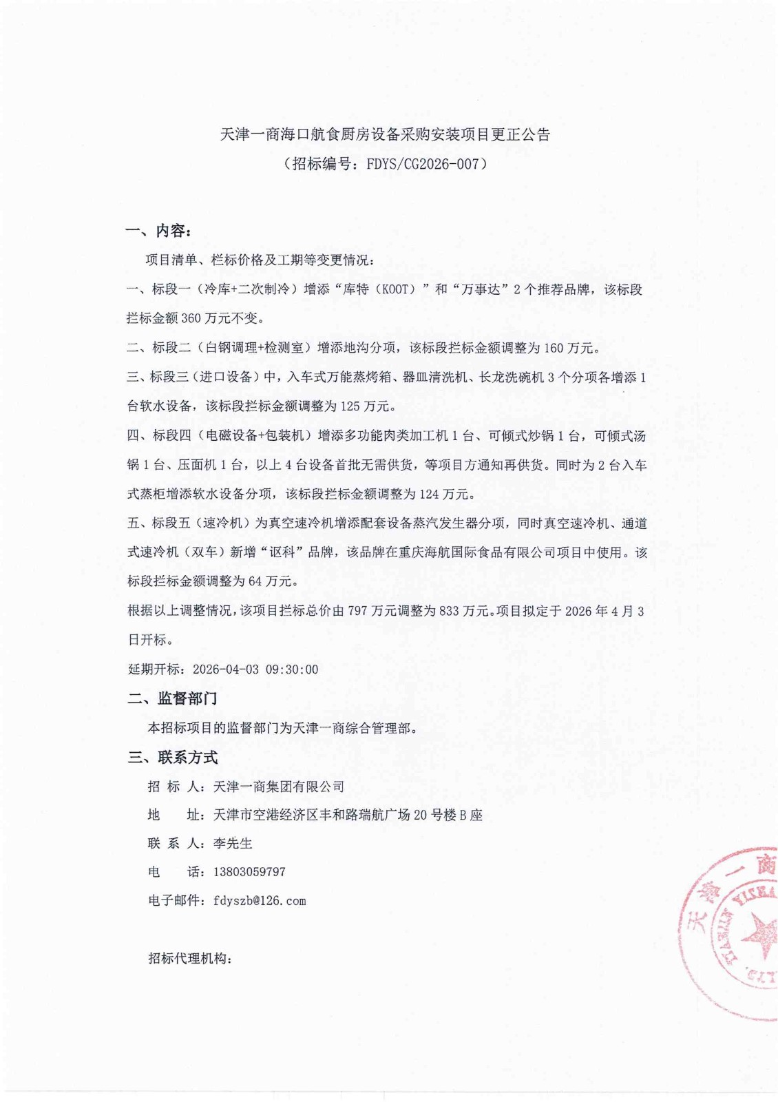 天津一商海口航食厨房设备采购安装项目更正公告