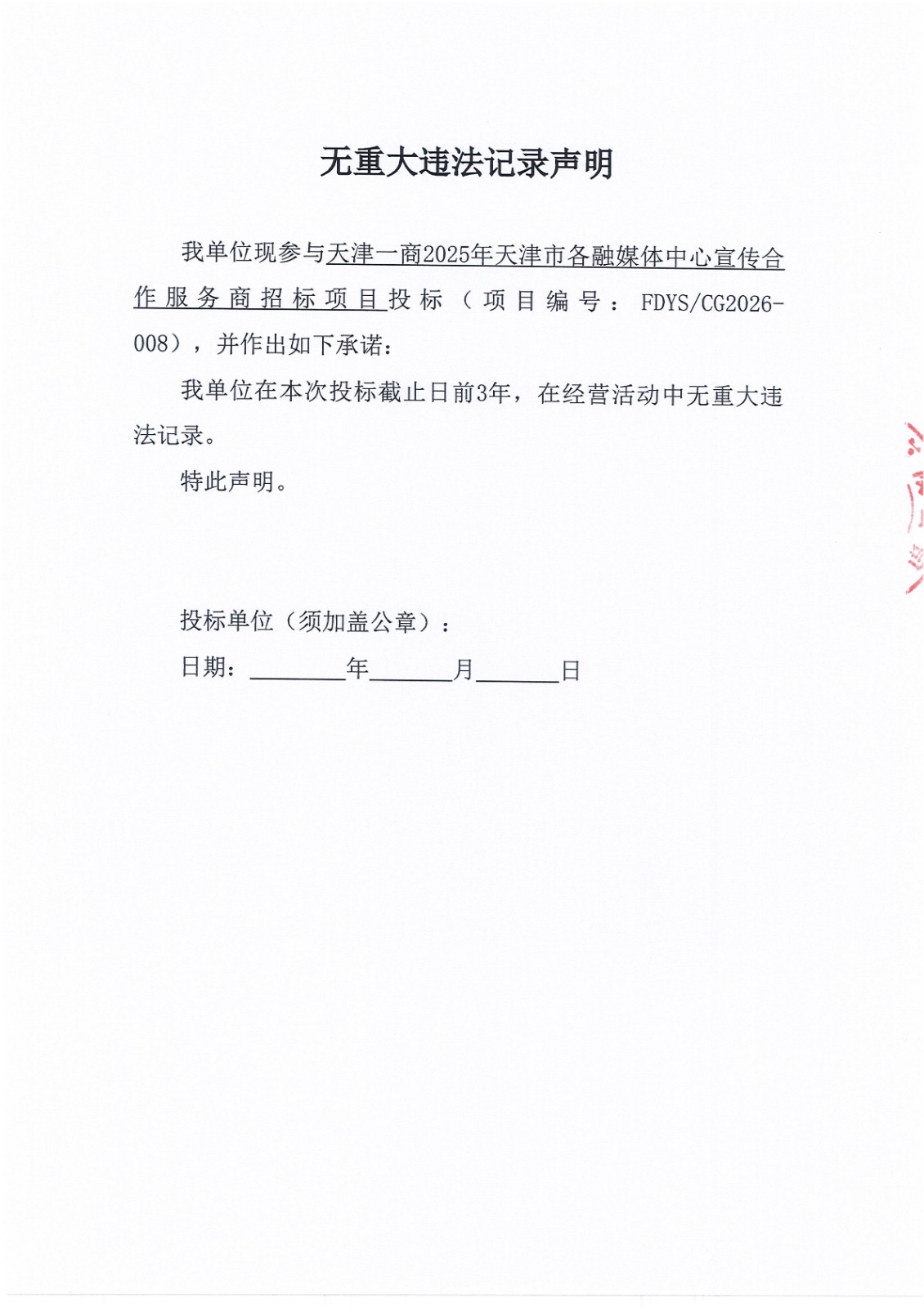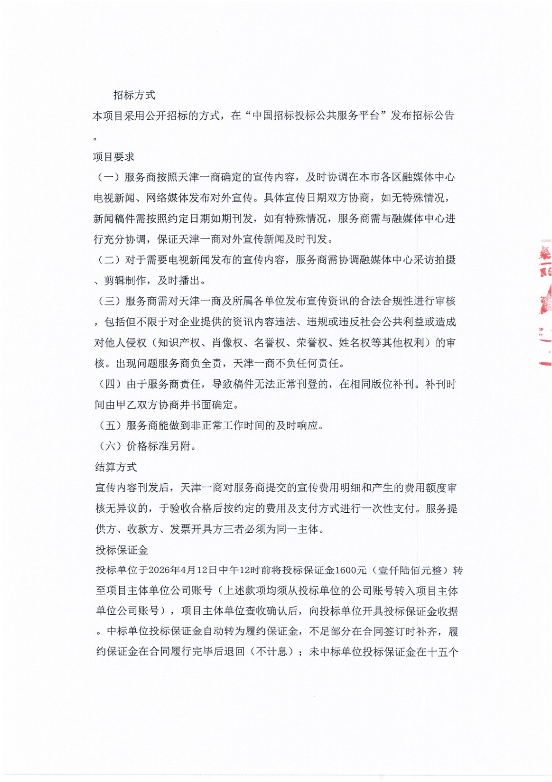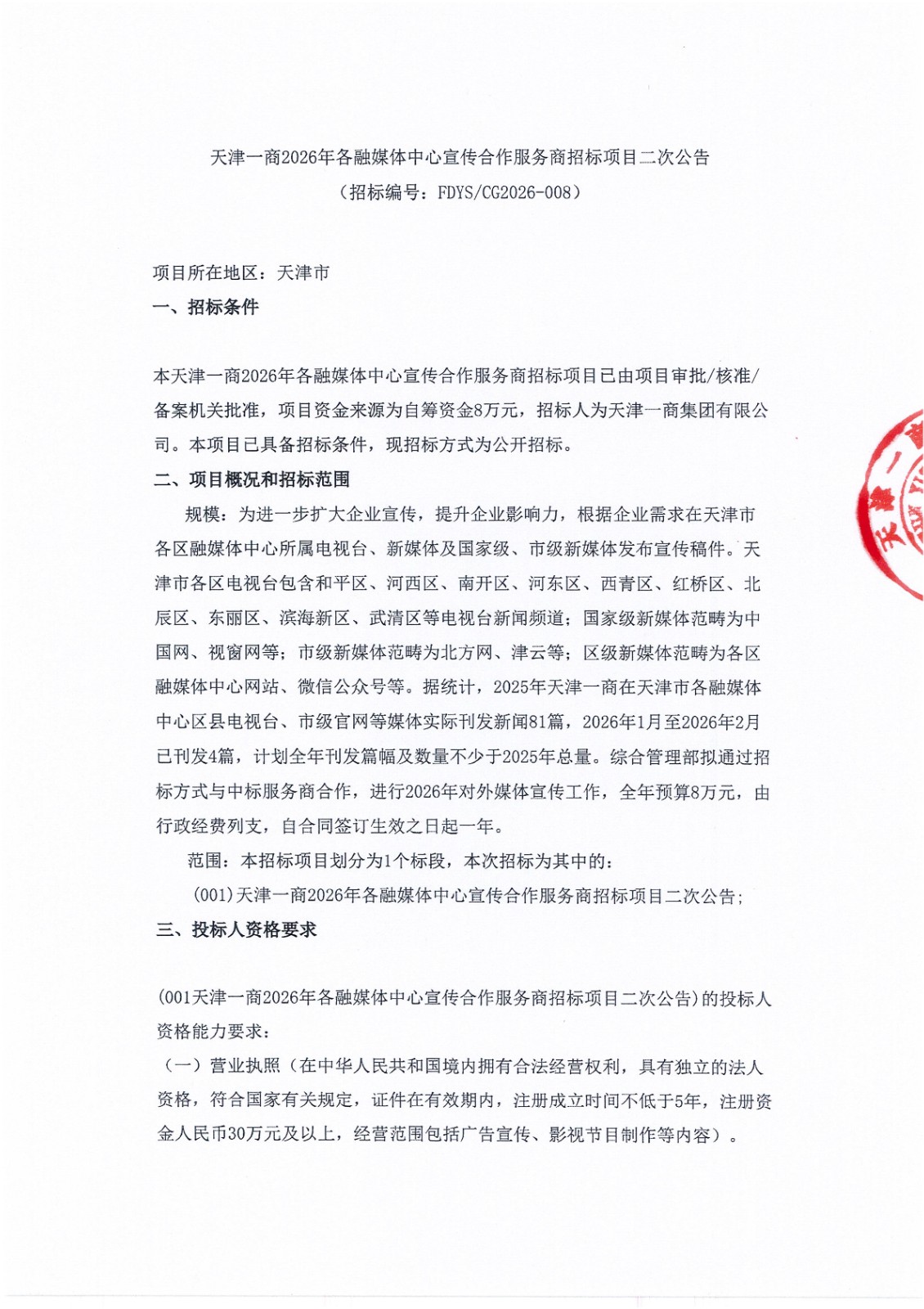 天津一商2026年各融媒体中心宣传合作服务商招标项目二次公告