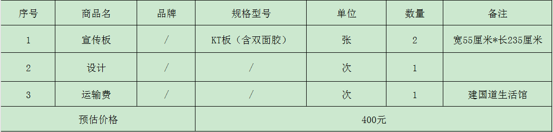(一)项目名称:贸易二部采购2张KT板,用于建国道门头宣传使用